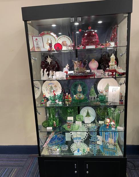 Our current display at the Jefferson Parish East Bank Regional Library. December's display features vintage glassware with a holiday theme.